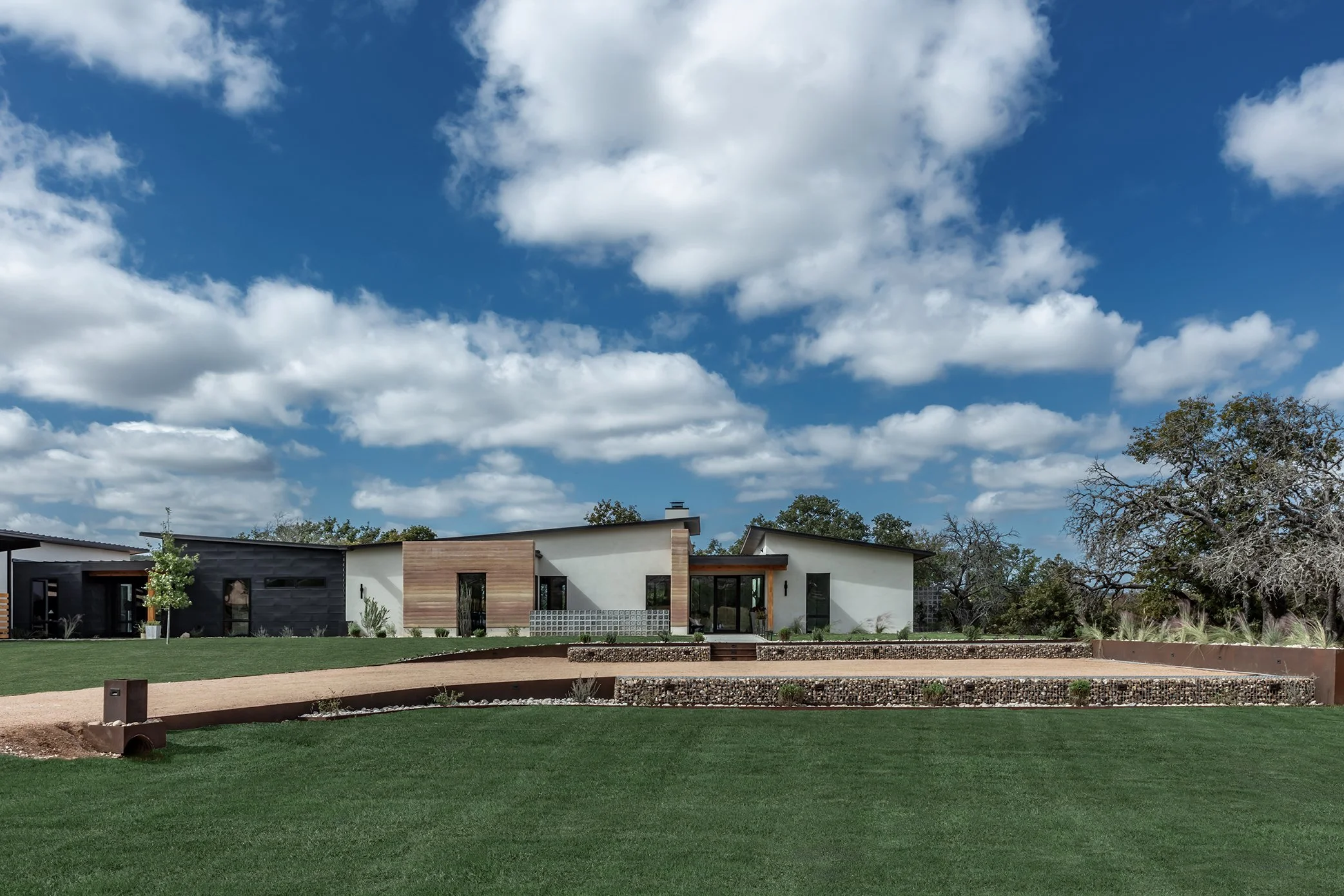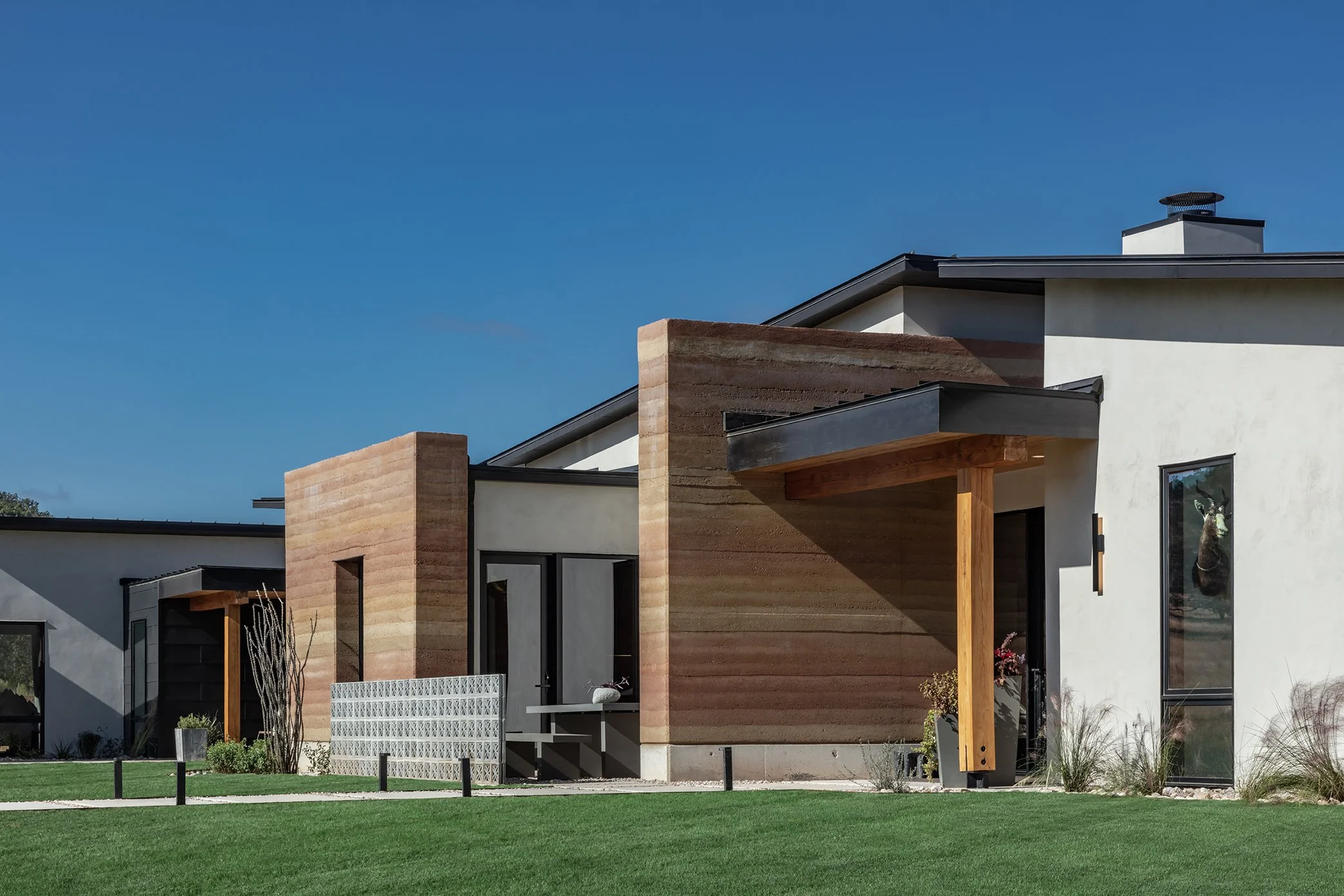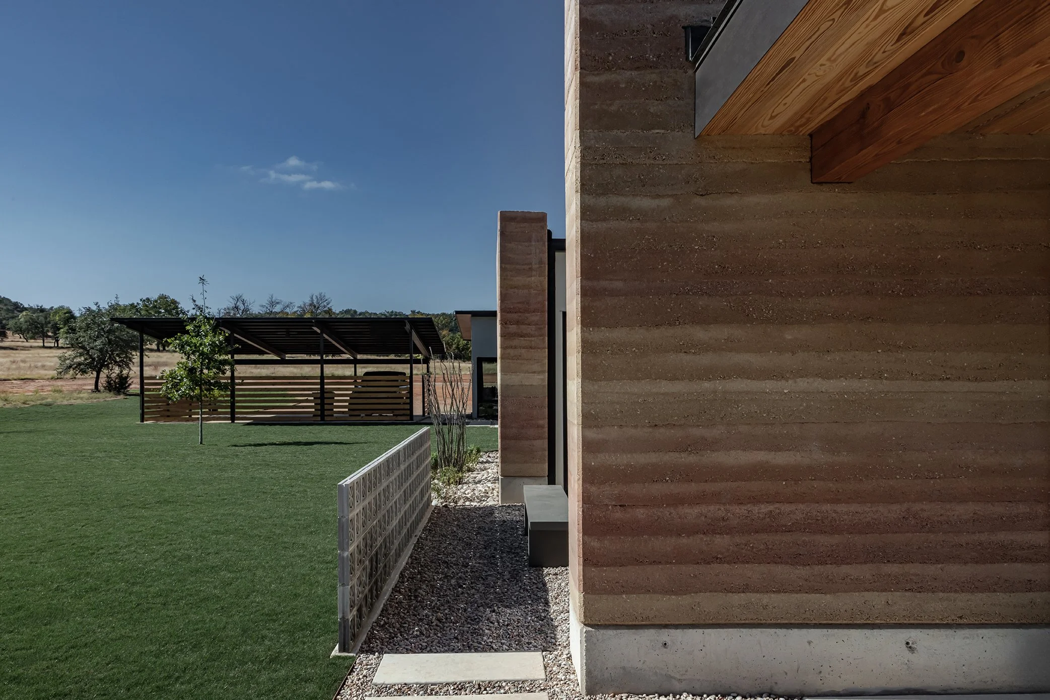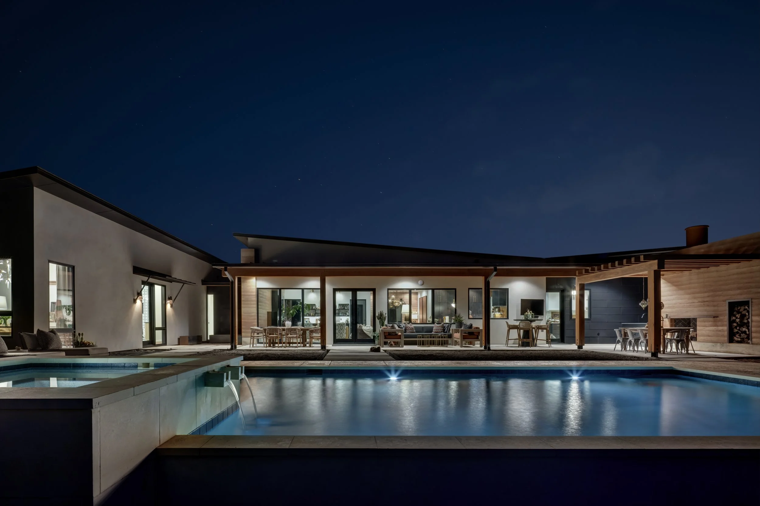 The Rammed Earth Project is a one-of-a-kind custom home where we blended natural materials with modern architecture to create something truly timeless. We crafted rammed earth walls, layered in handcrafted millwork, and designed custom elements like a carved pink stone vanity and expansive Sierra Pacific windows that frame the Texas Hill Country. Built with energy efficiency and long-term comfort in mind, we integrated advanced insulation systems, whole-home air filtration, and a 10,000-gallon rainwater catchment system, along with outdoor features including a steel carport, rammed earth fireplace, pool, and tailored hardscapes for a complete living experience.